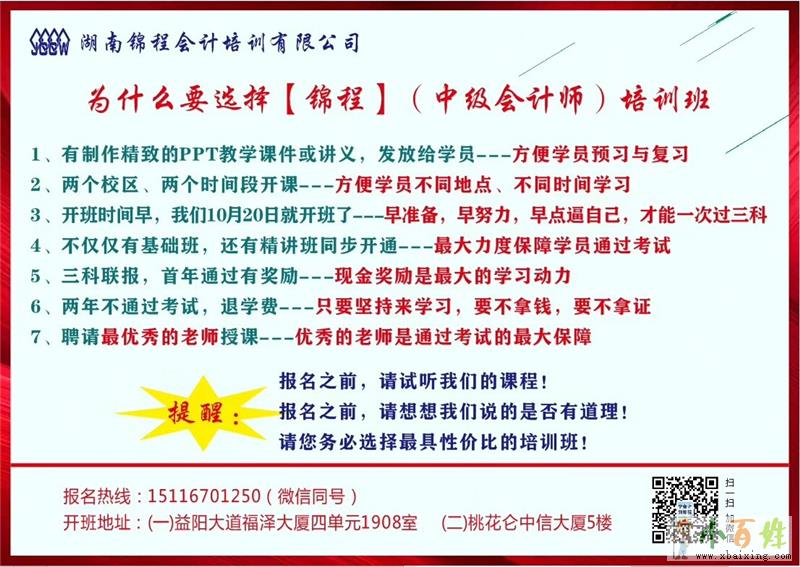 【湖南锦程会计培训有限公司】总面积2000平米,设立两个校区(桃花仑中信大厦校区、益阳大道福泽大厦校区),授课老师全部具有注册税务师或者会计师职称,是一所大型的、专业的财税类培训机构!x~b~a~i~x~i~n~g~c~o~mZBsx~b~a~i~x~i~n~g~c~o~m
